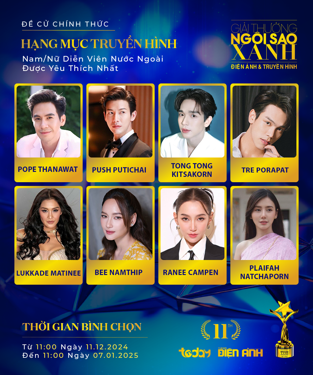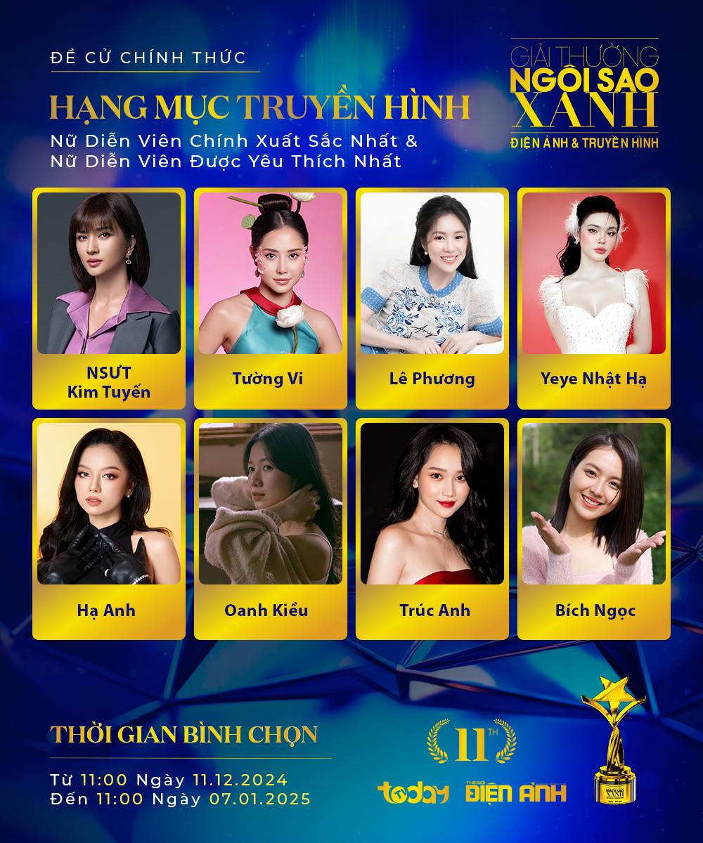 DANH SÁCH CHÍNH THỨC CÁC ĐỀ CỬ TẠI HẠNG MỤC TRUYỀN HÌNH - GIẢI THƯỞNG NGÔI SAO XANH LẦN THỨ 11 Phim hay nhất (do HĐNT bình chọn) và Phim truyền hình Việt Nam được yêu thích nhất (do Khán giả bình chọn): Bên bờ hạnh phúc, Đánh cắp số phận, Người thầm lặng, Tình yêu bất tử, Một nửa hoàn hảo, Xuân à cưới nha,Đi về phía lửa, Nữ luật sư, Bí mật người thừa kế, Bí mật người thừa kế, Miền quên lãng, Thế giới trong gương, Tình yêu đến cùng gió biển, Những ngôi sao lạc, Mùa sậy trổ bông. Đạo diễn xuất sắc nhất (do HĐNT bình chọn): Đạo diễn Nguyễn Dương, Đạo diễn Chu Thiện, Đạo diễn Trương Dũng, Đạo diễn Xuân Phước, Đạo diễn Nguyễn Đức Nhật Thanh, Đạo diễn Trần Thanh Huy, Đạo diễn NSND Trọng Trinh & Đạo diễn Lê Minh, Đạo diễn Dũng Nghệ, Đạo diễn Hồng Phúc, Đạo diễn Võ Hồng Loan. Nam diễn viên chính xuất sắc nhất (do HĐNT bình chọn) & Nam diễn viên được yêu thích nhất (do Khán giả bình chọn): NSƯT Nguyễn Ngọc Quỳnh, NSƯT Trương Minh Quốc Thái, Triệu An, Nguyễn Quốc Trường Thịnh, Thuận Nguyễn, Thanh Thức, Phạm Huỳnh Hữu Tài, Huỳnh Trường Thịnh, Anh Tài, Trịnh Xuân Nhản, Bảo Trung, Lãnh Thanh, Xuân Phúc, Huy Cường, Lê Quang Vinh, Đạt Nguyễn. Nữ diễn viên chính xuất sắc nhất (do HĐNT bình chọn) & Nữ diễn viên được yêu thích nhất (do Khán giả bình chọn): NSƯT Kim Tuyến, Bích Ngọc, Trúc Anh, Yeye Nhật Hạ, Hạ Anh, Tường Vi, Xuân Văn, Bích Hằng, Hồ Thu Anh, Lê Phương, Thi Thi Đỗ, Nghiêm Nhi, Dương Châu Uyên, Oanh Kiều. Nam phụ xuất sắc nhất (do HĐNT bình chọn): NSƯT Linh Trung, Huỳnh Trường Thịnh, Nguyên Vũ, Nguyễn Dương, Quốc Huy, Huy Cường, Trung Dũng, Doãn Quốc Đam, Phước Tài, Steven Nguyễn, Bùi Tấn Hảo, Thanh Duy, Lê Nguyên Bảo. Nữ phụ xuất sắc nhất (do HĐNT bình chọn): NSƯT Tuyết Thu, Thúy Diễm, Tăng Huỳnh Như, Kim Đào, Thục Anh, Thu Bi, Hồ Lệ Thu, Tôn Nữ Khánh Uyên, Lê Lộc, Thân Thúy Hà. Gương mặt triển vọng (do HĐNT bình chọn): Tú Tri, Trần Ngọc Vàng, Huyền Trâm, Hoàng Yến, Bé Shin và Nhật Huy An. Phim truyền hình nước ngoài được yêu thích nhất (do Khán giả bình chọn): Tình người duyên ma, Vệ nữ viên ngọc thần, Ngược dòng thời gian để yêu anh 2, Showbiz đại chiến, Cô dâu của thần rắn, Thanh mai trúc mã, Em biết em yêu anh, Khởi nghiệp, Oan gia phòng cấp cứu, Lỡ yêu người thừa kế. Nam diễn viên nước ngoài được yêu thích nhất (do Khán giả bình chọn): Jirayu La-ongmanee, Adhvik Mahajan, Pope Thanawat, Push Puttichai, Tre Porapat, Tong Tong Kitsakorn, Trương Vãn Ý, Poompat Iam-saman, Sean Jindachot, Shehzada Dhami. Nữ diễn viên nước ngoài được yêu thích nhất (do Khán giả bình chọn): Atitaya Tribudarak, Nyra Banerjee, Ranee Campen, Bee Namthip, Lukkade Metinee, Plaifah Natchaporn, Tôn Di, Kemisara Paladesh, Nalinthip Sakulongumpai, Krishna Mukherjee. Gala trao giải Ngôi Sao Xanh lần thứ 11 - năm 2024 dự kiến sẽ diễn ra tại Nhà thi đấu Nguyễn Du - 116 Nguyễn Du, Phường Bến Thành, Quận 1, Thành phố Hồ Chí Minh vào lúc 18h00 ngày 11/01/2025. Chương trình sẽ được truyền hình trực tiếp lúc 20h00 trên TodayTV (VTC7), livestream trên các kênh fanpage Ngôi Sao Xanh, TodayTV, YouTV và youtube TodayTV. |